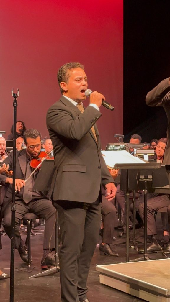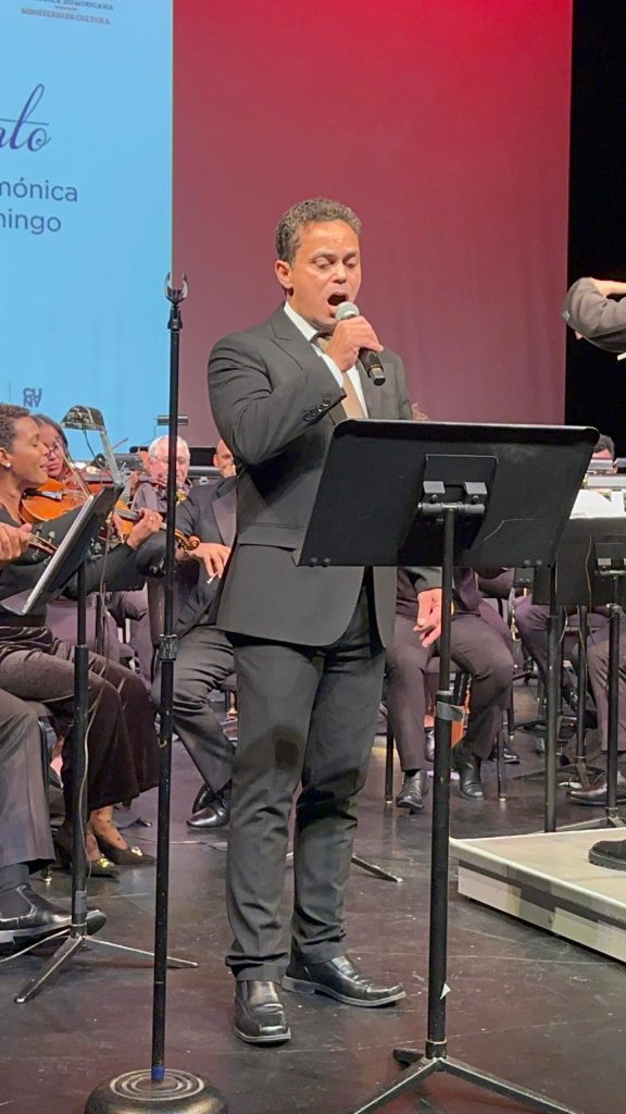 Un momento especial de la noche fue la participación del profesor de canto y teatro Engel Brito, docente del programa educativo de la Dirección de Cultura Dominicana en el Exterior, quien se unió a la orquesta y recibió una cálida ovación del público.