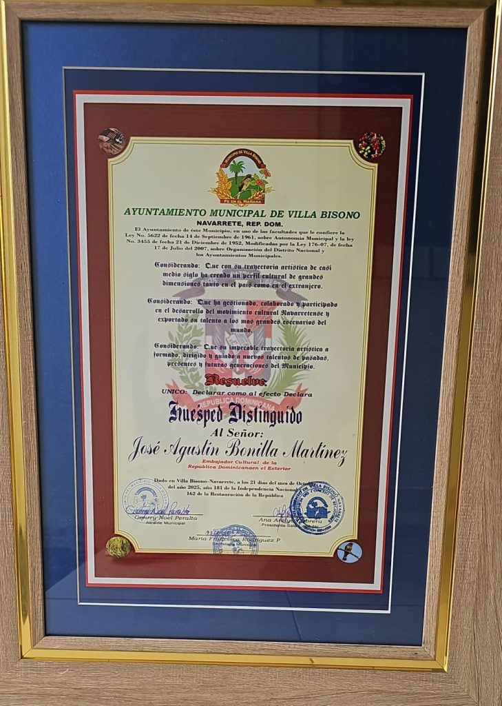 VILLA BISONÓ, REPÚBLICA DOMINICANA. – En un emotivo acto celebrado en el Ayuntamiento Municipal de Villa Bisonó, el destacado gestor cultural José Agustín Bonilla Martínez, actual Director de Cultura Dominicana en el Estado de New Jersey, fue reconocido como “Hijo Distinguido y Embajador Cultural de la República Dominicana en el Exterior”, por sus notables aportes al arte, la cultura y la proyección internacional del municipio de Navarrete.