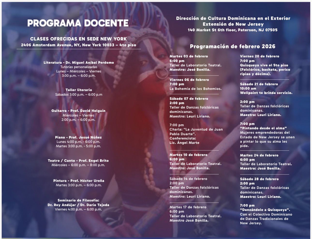 De su lado, la Extensión de la Dirección de Cultura Dominicana en el Exterior en Nueva Jersey, con sede en el 140 Market Street, sexto piso, Paterson, y encabezada por el profesor y teatrista José Bonilla, presentó una nutrida programación cultural correspondiente a febrero de 2026, centrada en el teatro, la danza, la historia y la música tradicional dominicana.
