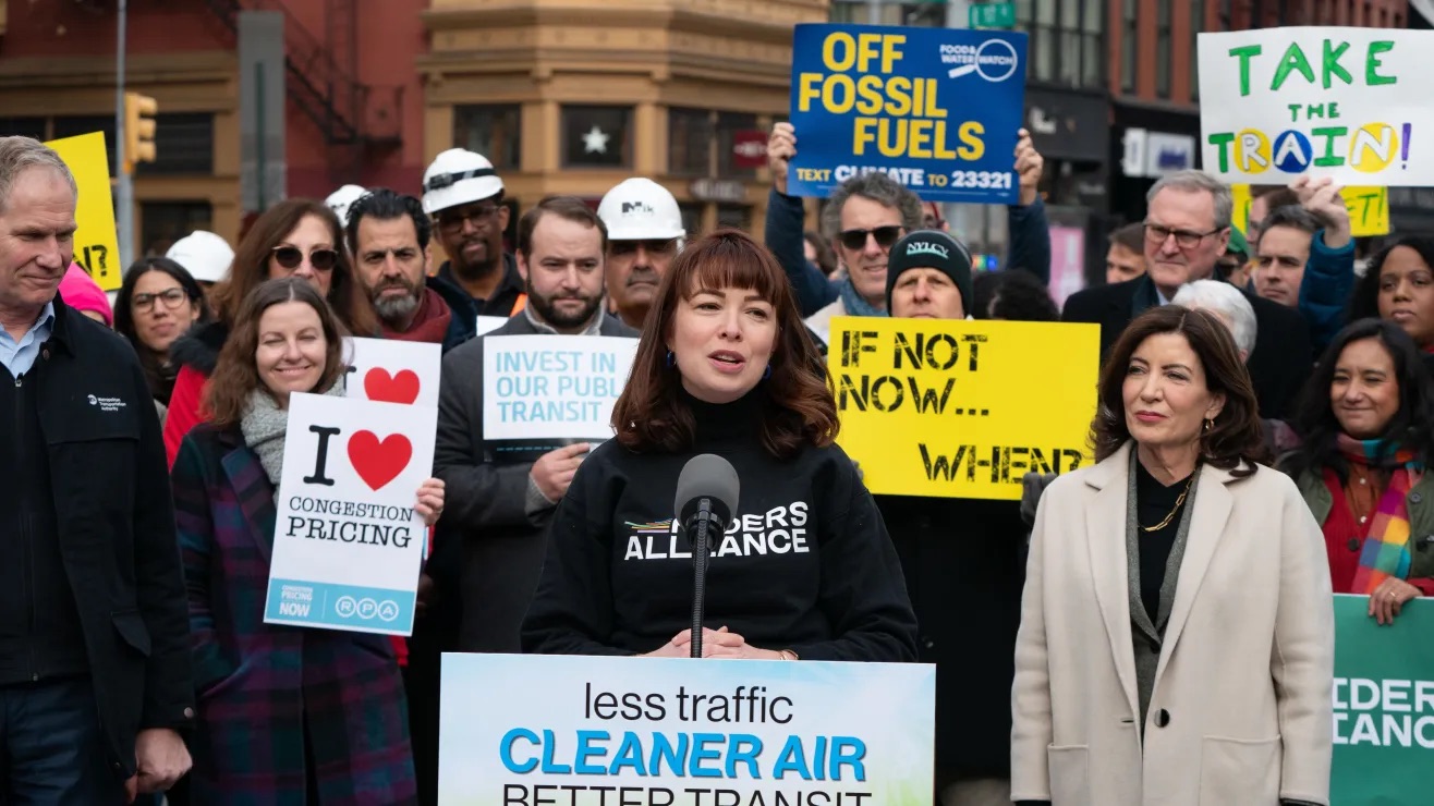 Danny Pearlstein, director de políticas y comunicaciones de Riders Alliance, insta a Trump y Hochul a no poner en riesgo los planes de mejora del transporte público. «En lugar de negociar contra Nueva York y volver a echar por la borda a los pasajeros de autobús, la gobernadora Hochul debe defender firmemente el alivio de la congestión», afirmó Pearlstein. «Millones de pasajeros necesitan calles descongestionadas e importantes nuevas inversiones federales en nuestra red de transporte público.»