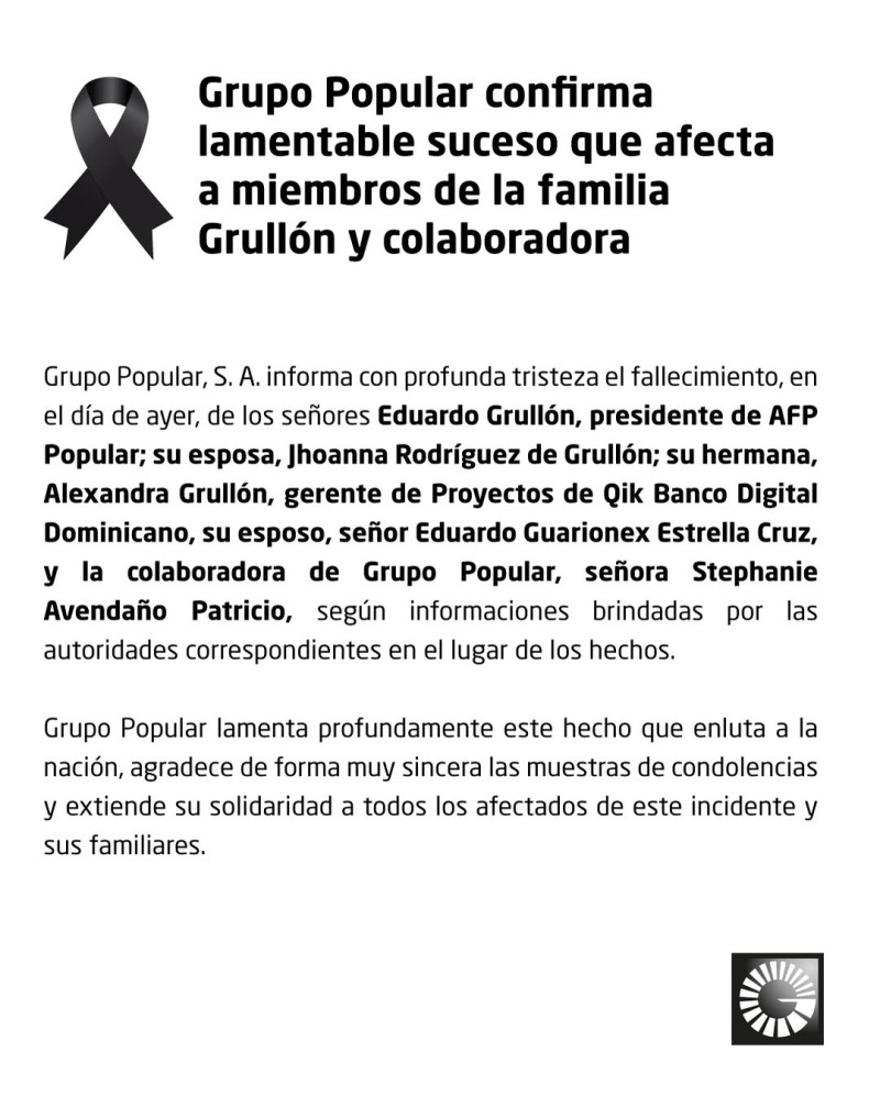 El Grupo Popular ha confirmado la muerte de Eduardo Guarionex Estrella, hijo del ministro de Obras Públicas y Comunicaciones, Eduardo Estrella, en el colapso del techo de la discoteca Jet Set. Junto a él, también perdieron la vida su esposa Alexandra Grullón y otros miembros del grupo empresarial Popular.